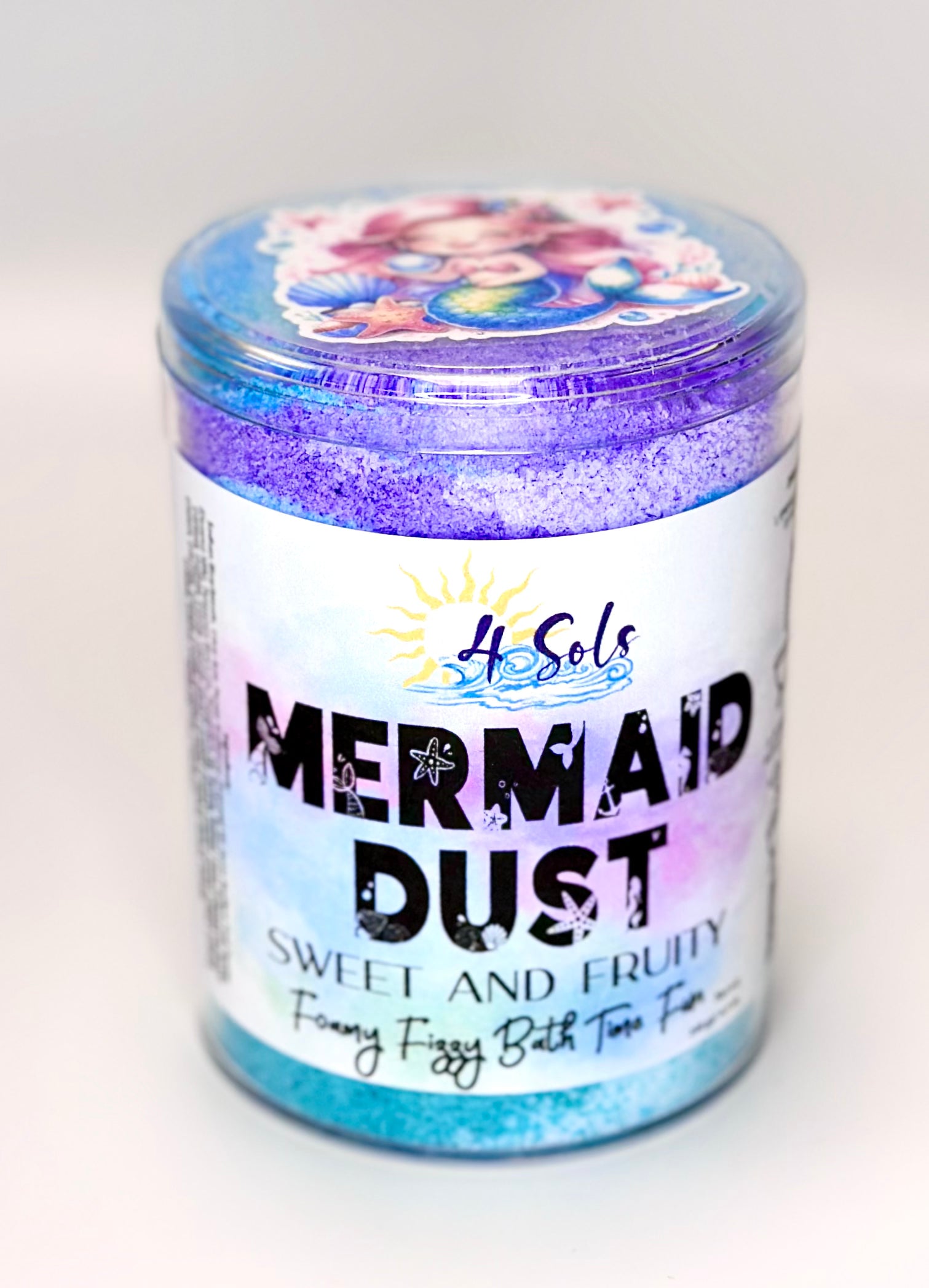 Sprinkle into tub of warm water. Allow for the Mermaid Dust to fizz and foam, with a little bit on shimmer dance on your water. Agitating water will create some foam, but not lots of bubbles.